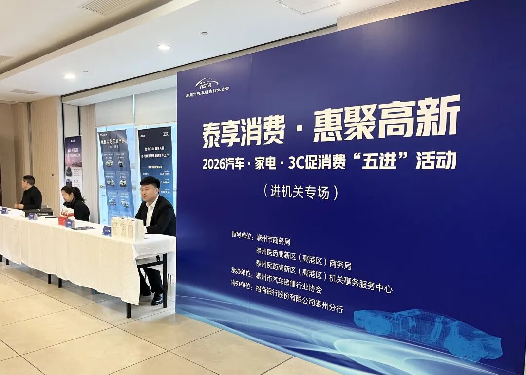 为进一步释放消费潜力,推动政策与产品“直达快享”,泰州医药高新区(高港区)紧扣“促消费、稳增长、惠民生”目标,通过“政府搭台、企业让利、群众受益”的联动模式,精心策划了2026年汽车、家电、3C促消费“五进”系列活动。3月30日,首场“进机关”活动正式拉开了全年“五进”活动的序幕。